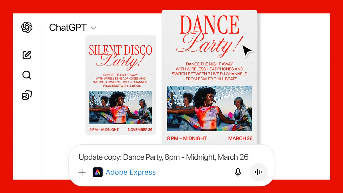 Adobe Express for ChatGPT brings template-driven design into the chatbot. Users can browse the Express library of layouts and graphics from within the conversation.