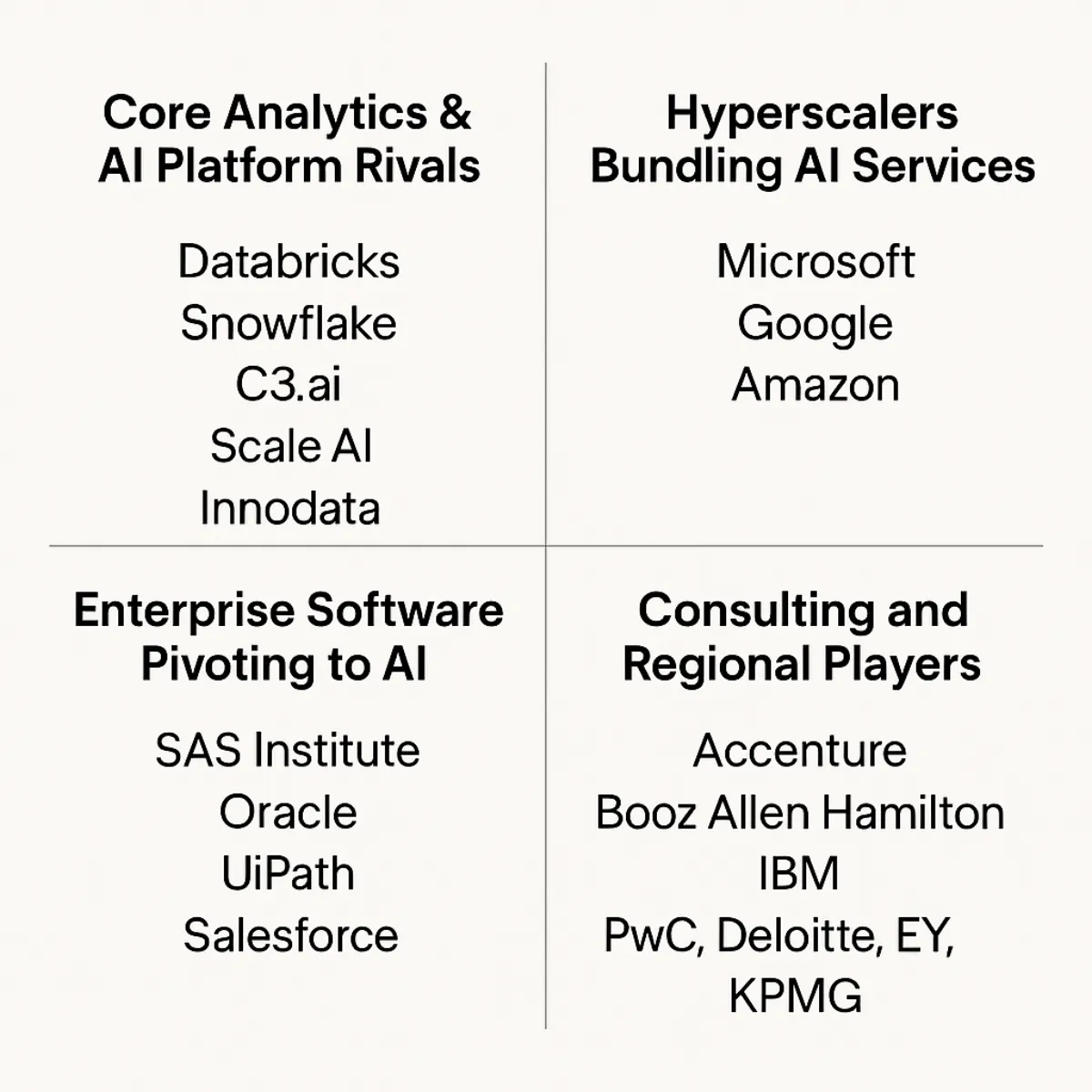 The competitive landscape reveals how massive this opportunity is. Here's a quick overview of just some of who are positioning to capture this demand in the value chain with Palantir: